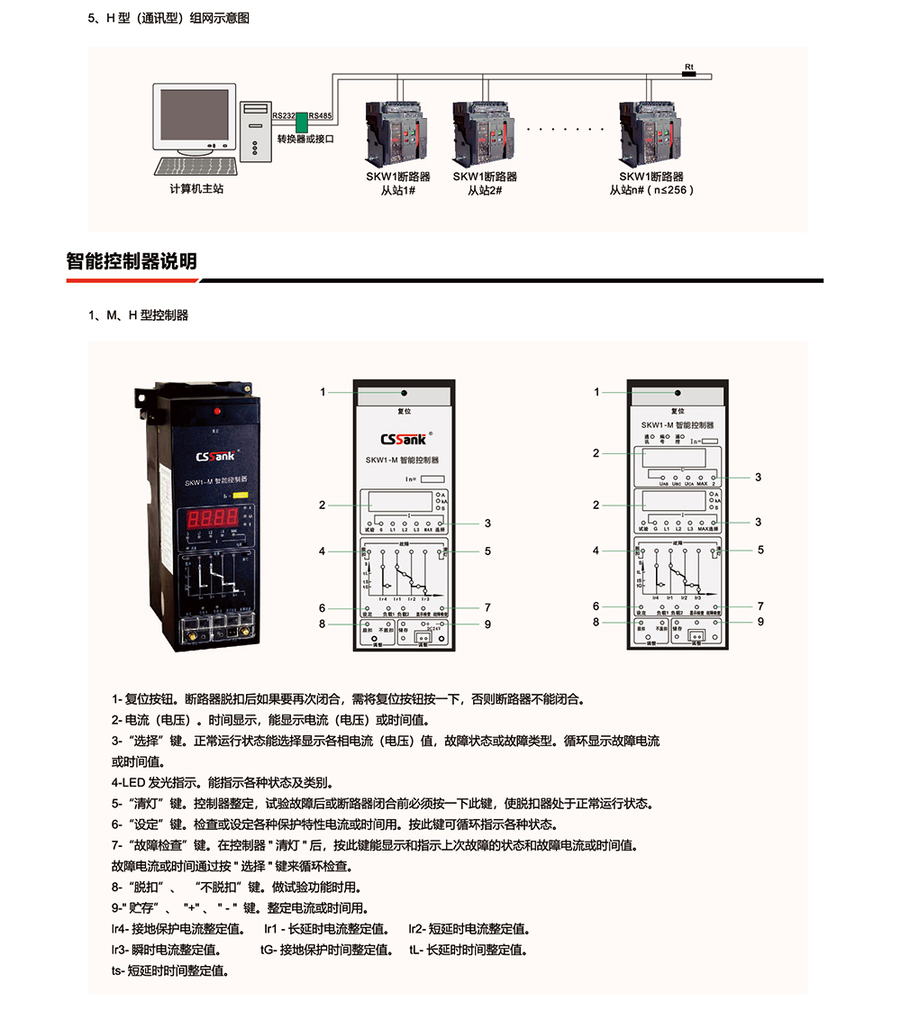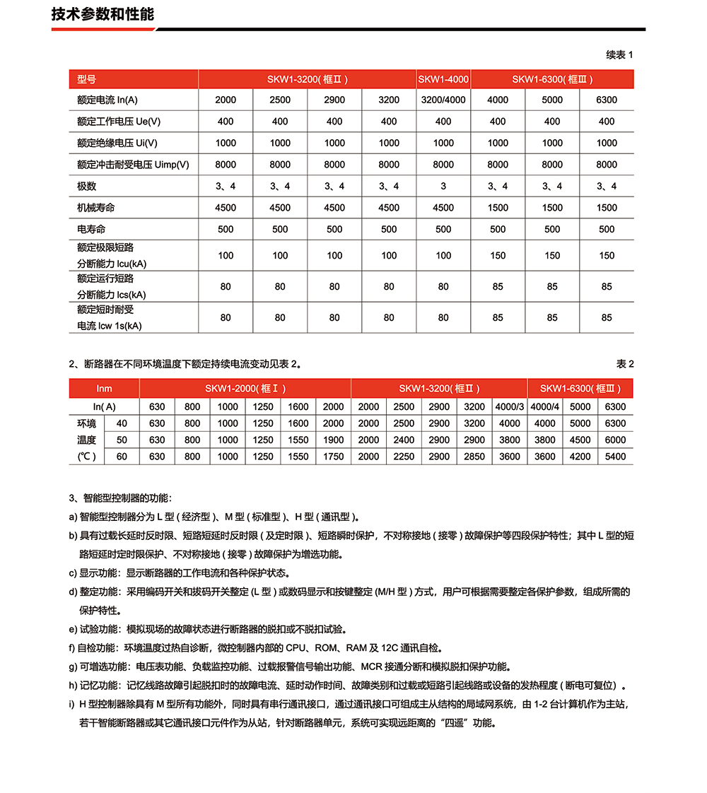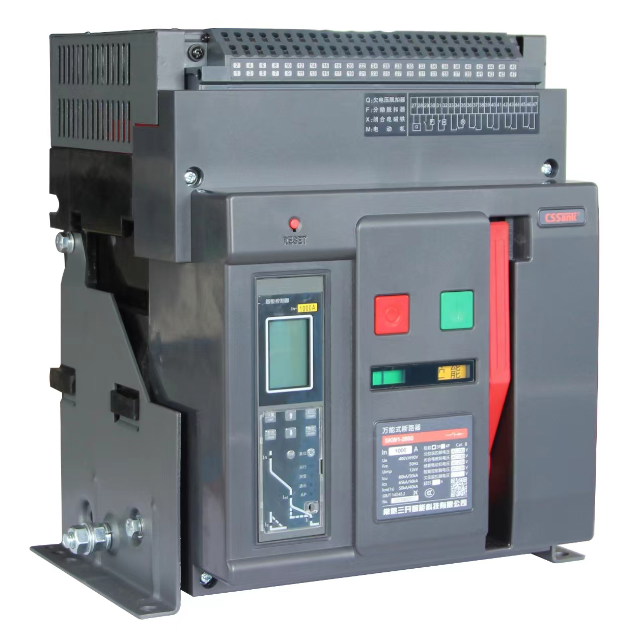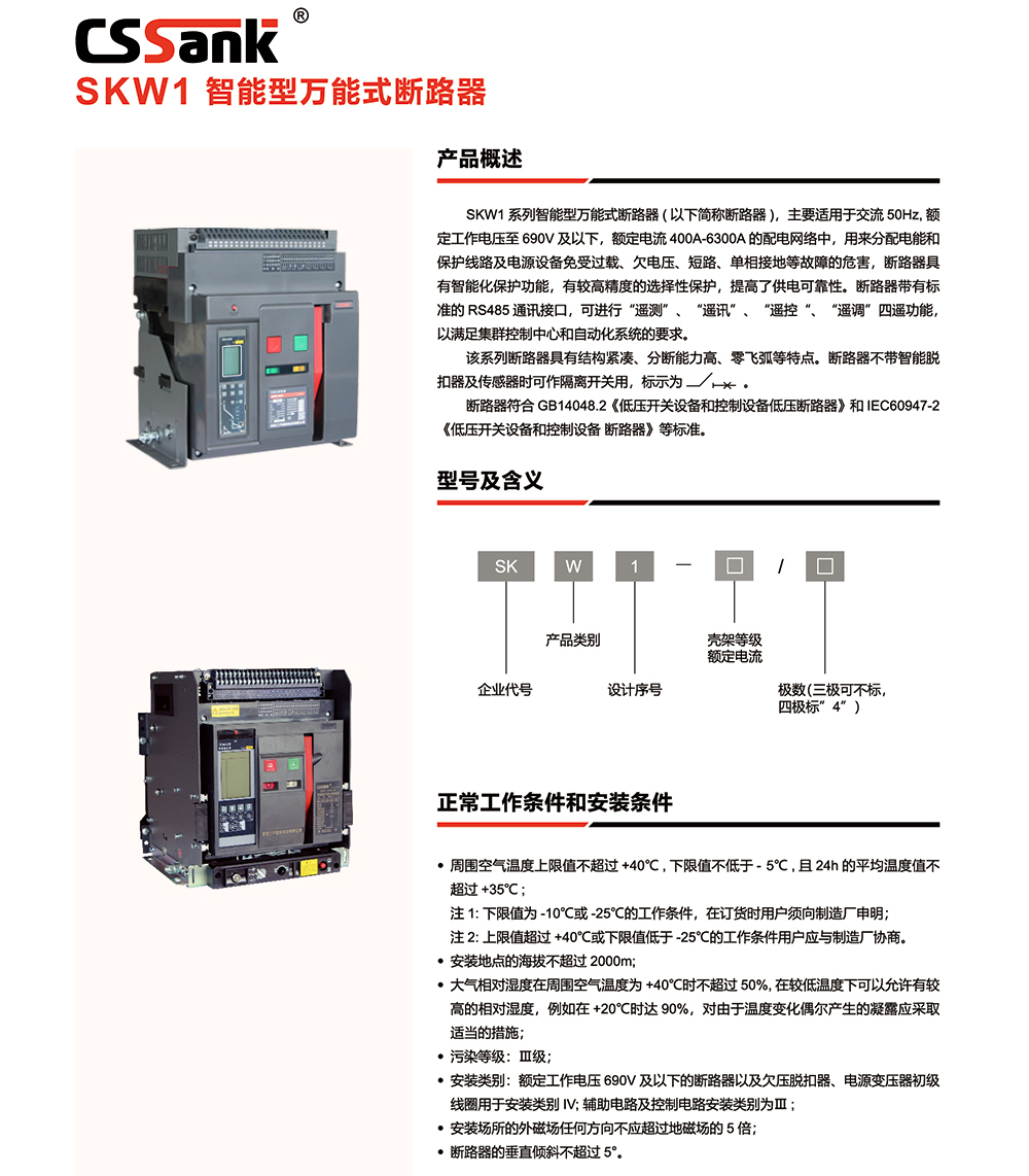 概述:SKW1系列智能型万能式断路器(以下简称断路器),主要适用于交流50Hz,额定工作电压至690V及以下,额定电流400A-6300A 的配电网络中,用来分配电能和保护线路及电源设备免受过载、欠电压、短路、单相接地等故障的危害,断路器具有智能化保护功能,有较高精度的选择性保护,提高了供电可靠性。断路器带有标准的RS485通讯接口,可进行“遥测”、“遥讯”、“遥控“、“遥调”四遥功能,以满足集群控制中心和自动化系统的要求。