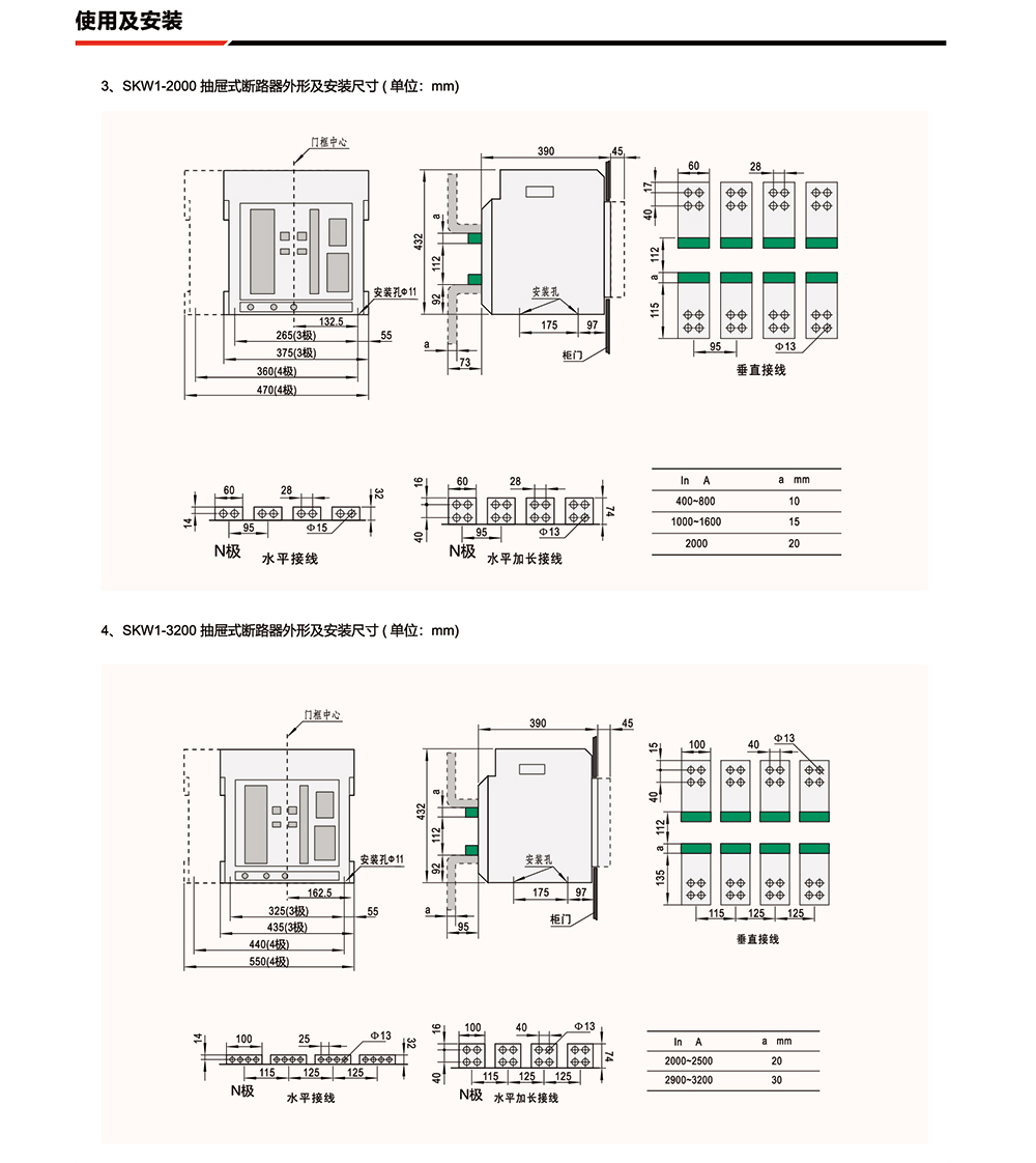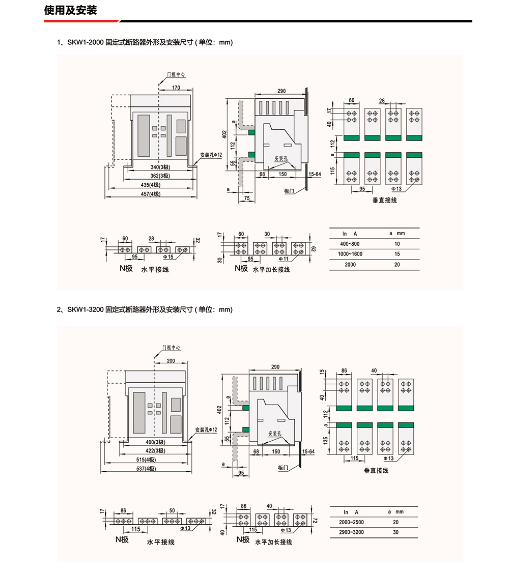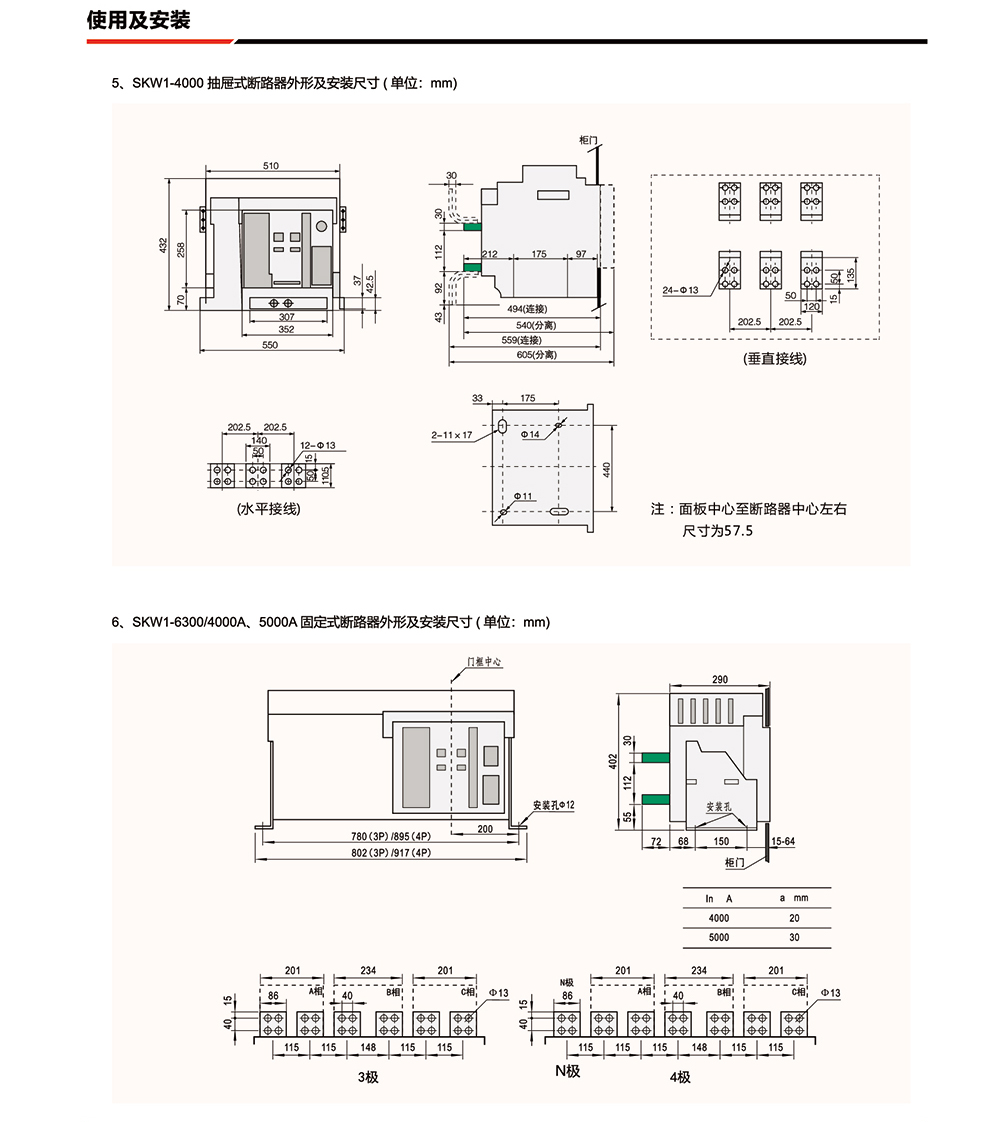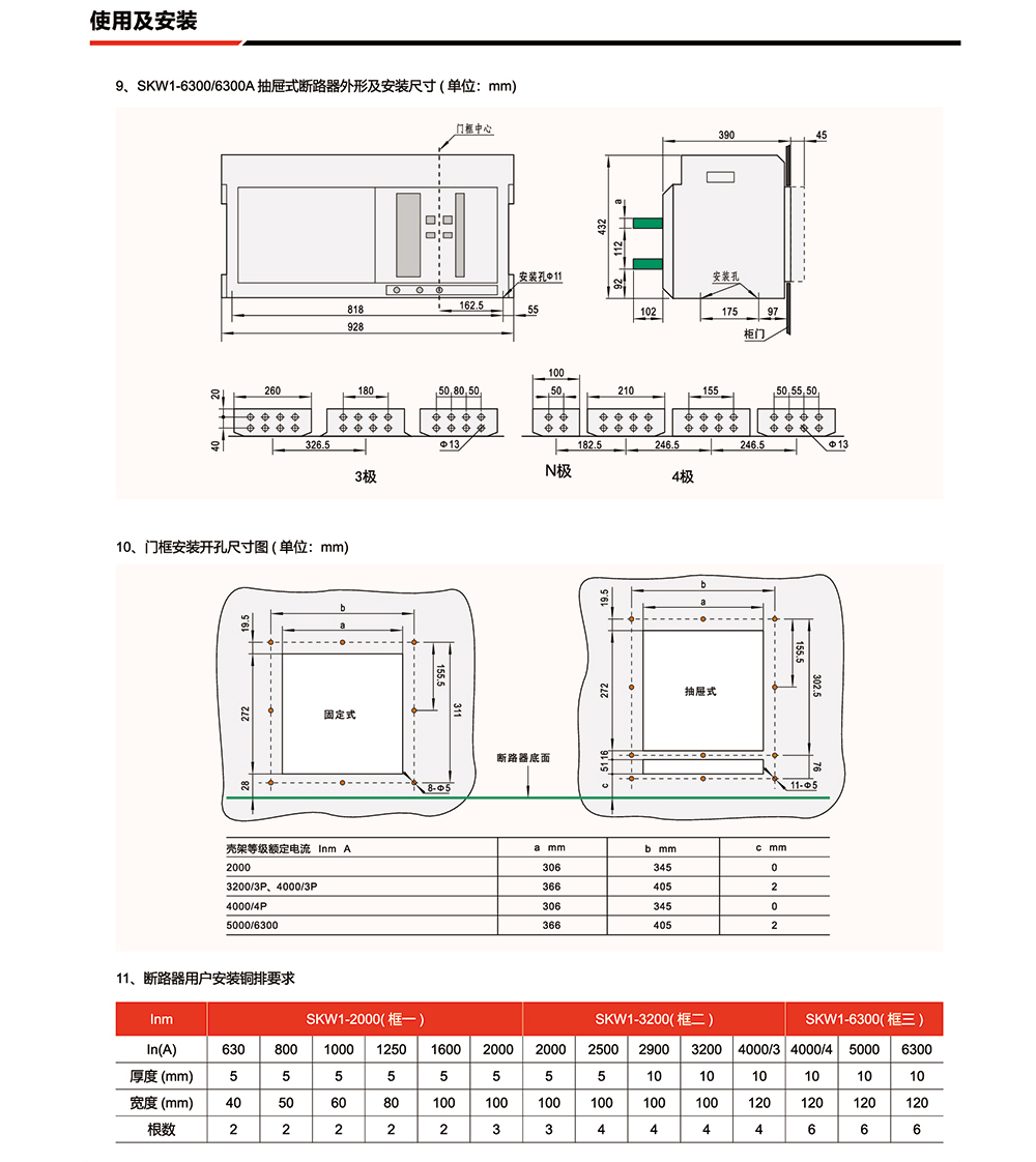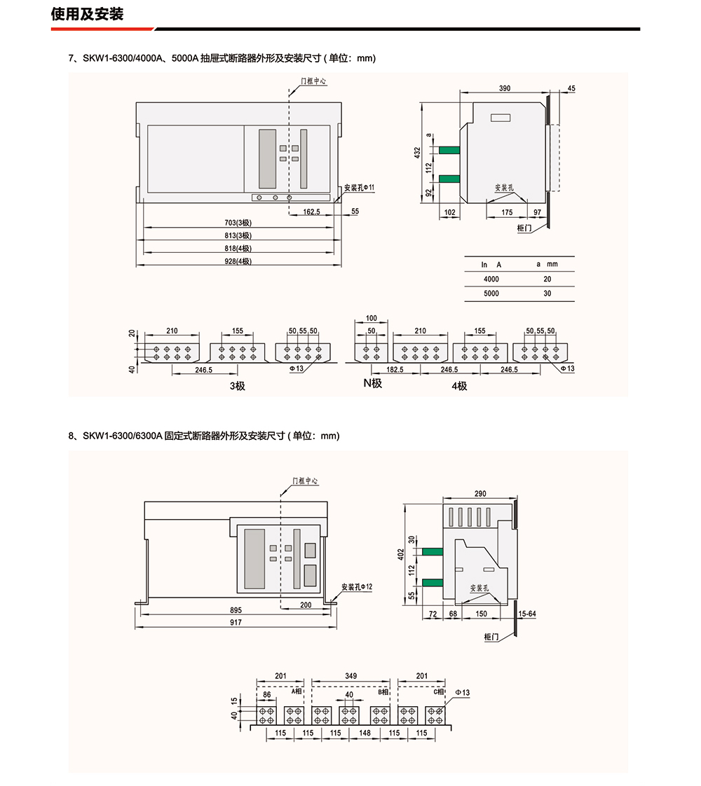 概述:SKW1系列智能型万能式断路器(以下简称断路器),主要适用于交流50Hz,额定工作电压至690V及以下,额定电流400A-6300A 的配电网络中,用来分配电能和保护线路及电源设备免受过载、欠电压、短路、单相接地等故障的危害,断路器具有智能化保护功能,有较高精度的选择性保护,提高了供电可靠性。断路器带有标准的RS485通讯接口,可进行“遥测”、“遥讯”、“遥控“、“遥调”四遥功能,以满足集群控制中心和自动化系统的要求。