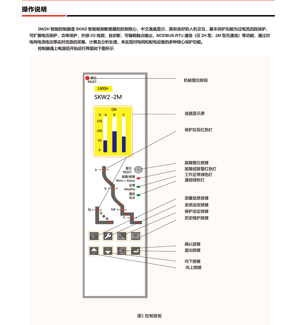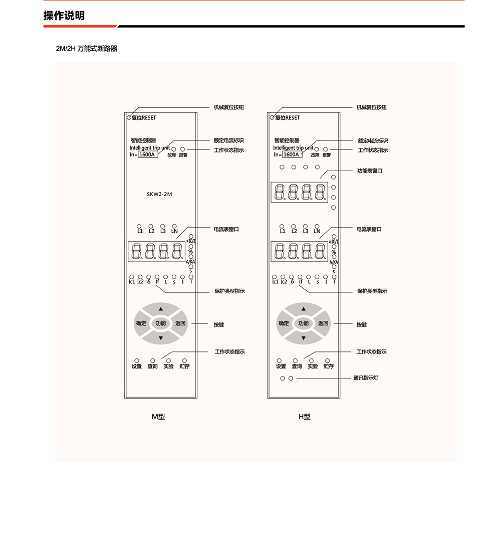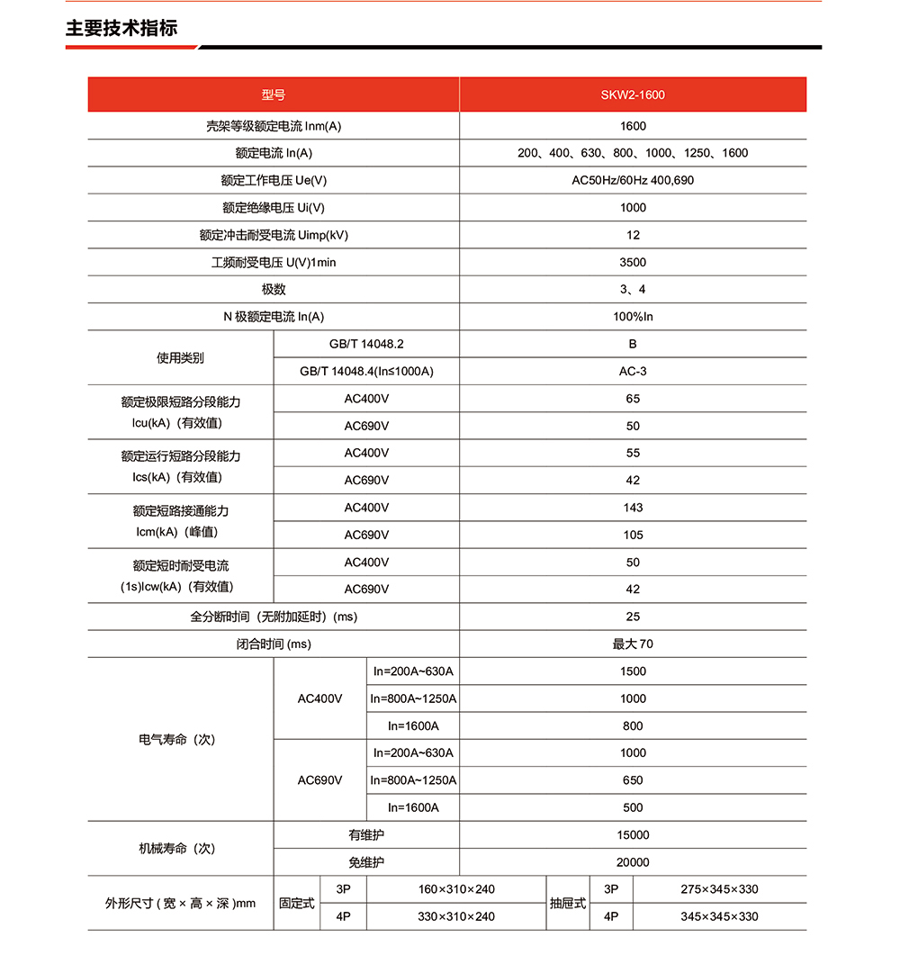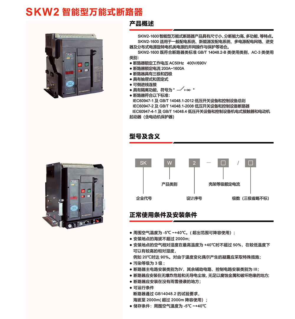 概述:SKW2-1600智能型万能式断路器产品具有尺寸小、分断能力高、多功能、等特点。SKW2-1600适用于一般配电系统、新能源发配电系统、多电源配电网络、逆变器及分布式电源旋转电机类电源的并网操作与保护等场合。 SKW2-1600 既符合断路器类标准GB/T 14048.2-B类使用类别,AC-3类使用