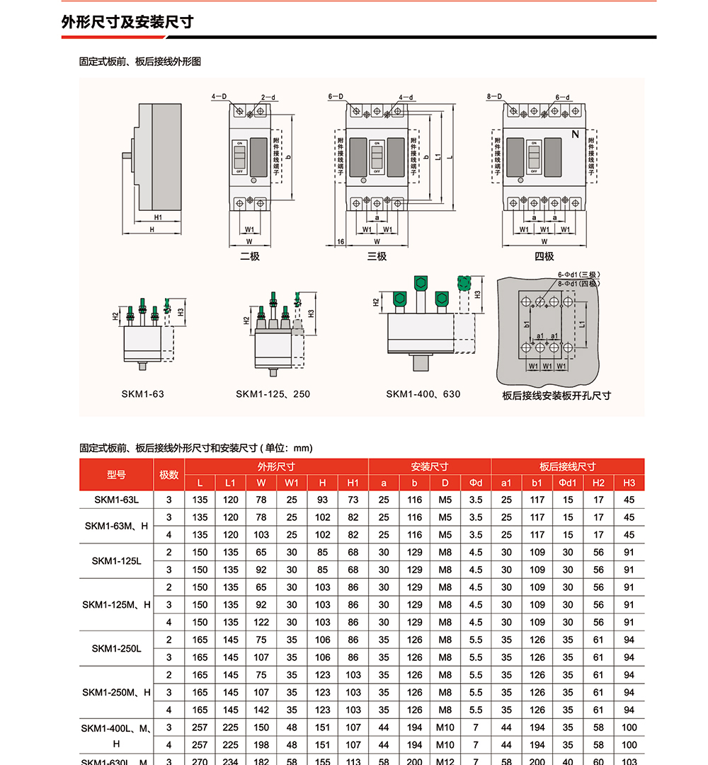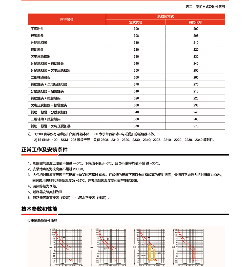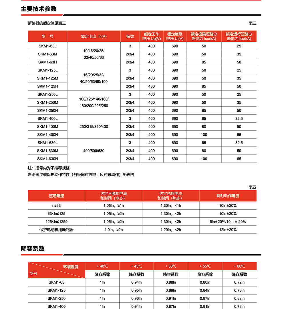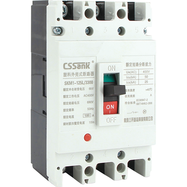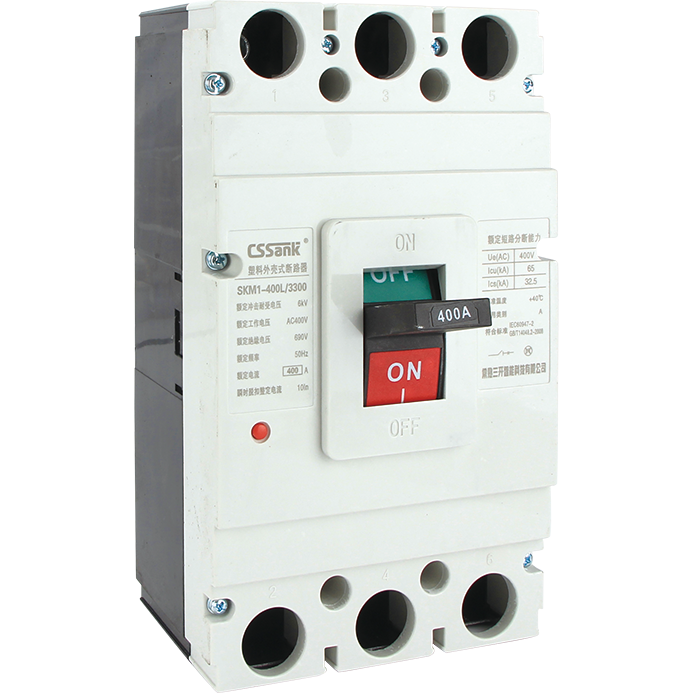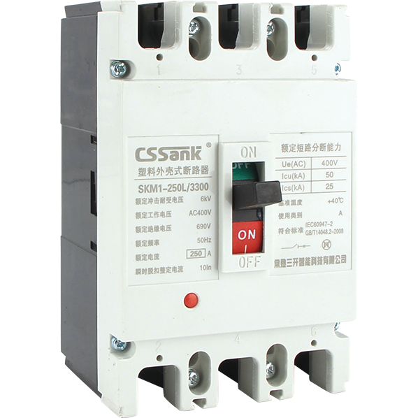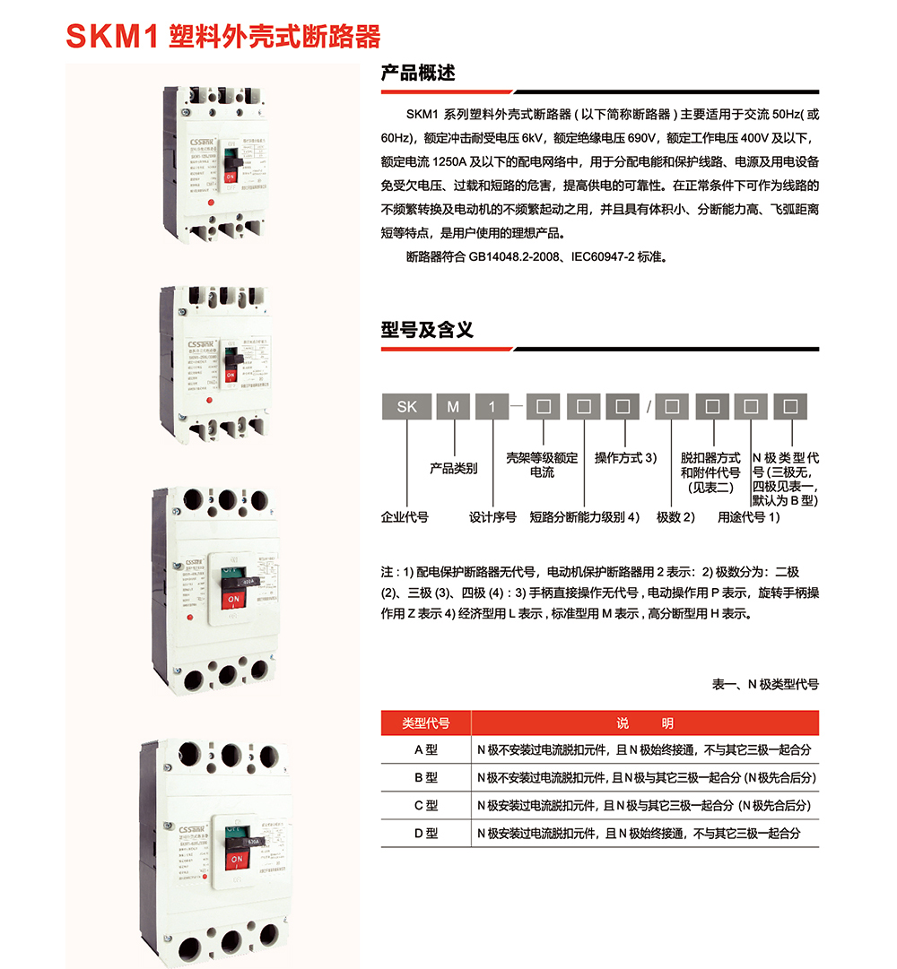 概述:SKM1系列塑料外壳式断路器(以下简称断路器)主要适用于交流50Hz或60Hz),额定冲击耐受电压6kV,额定绝缘电压690V,额定工作电压400V及以下,额定电流1250A 及以下的配电网络中,用于分配电能和保护线路、电源及用电设备免受欠电压、过载和短路的危害,提高供电的可靠性。在正常条件下可作为线路的不频繁转换及电动机的不频繁起动之用,并且具有体积小、分断能力高、飞弧距离短等特点,是用户使用的理想产品。