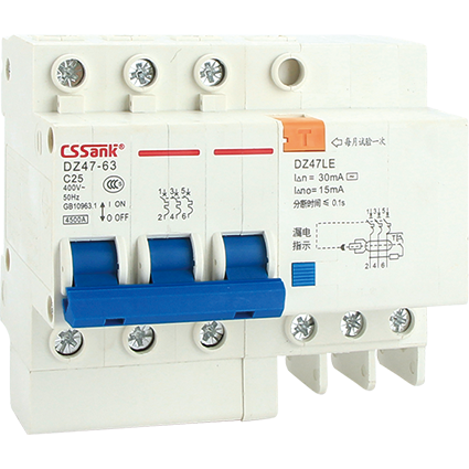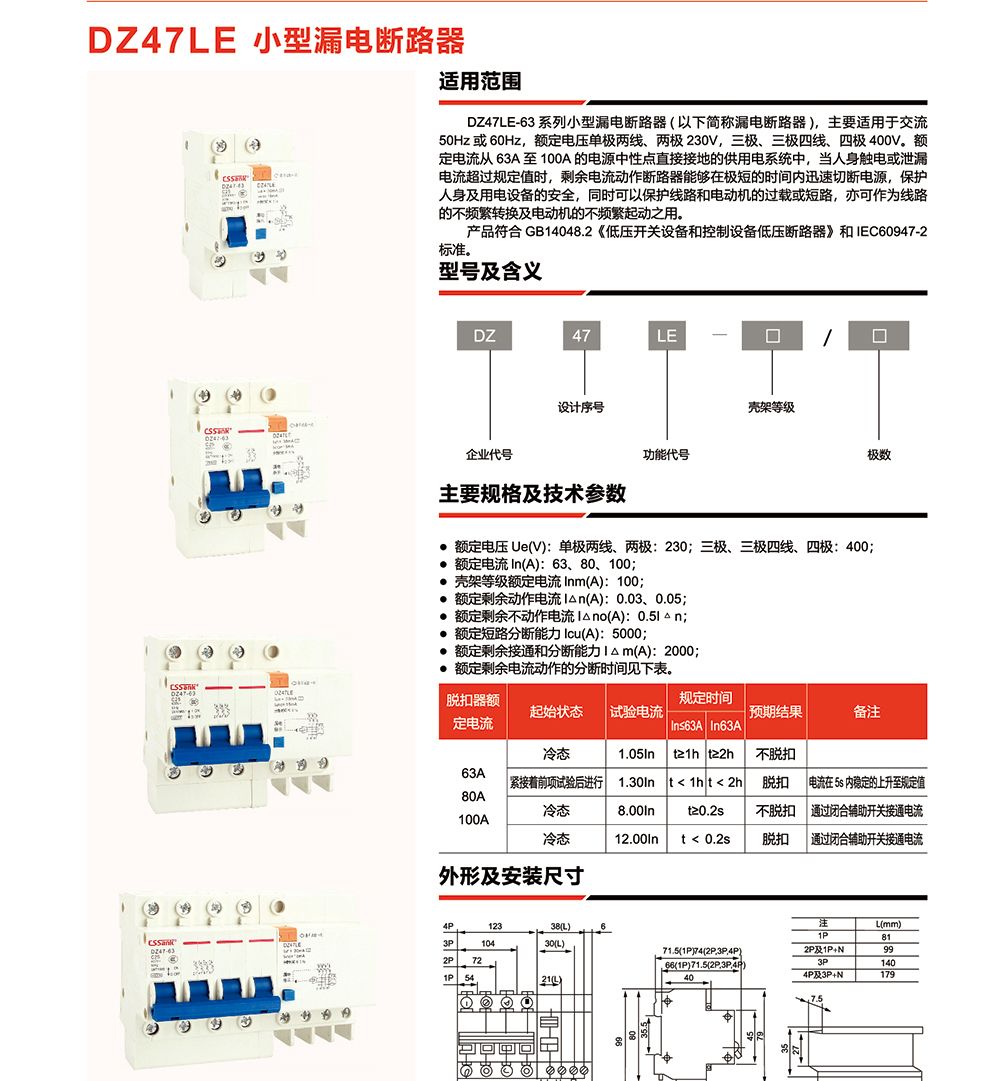 概述:DZ47LE-63系列小型漏电断路器(以下简称漏电断路器),主要适用于交流50Hz或60Hz,额定电压单极两线、两极230V,三极、三极四线、四极400V。额定电流从63A至100A的电源中性点直接接地的供用电系统中,当人身触电或泄漏电流超过规定值时,剩余电流动作断路器能够在极短的时间内迅速切断电源,保护人身及用电设备的安全,同时可以保护线路和电动机的过载或短路,亦可作为线路的不频繁转换及电动机的不频繁起动之用。 产品符合GB14048.2《低压开关设备和控制设备低压断路器》和IEC60947-