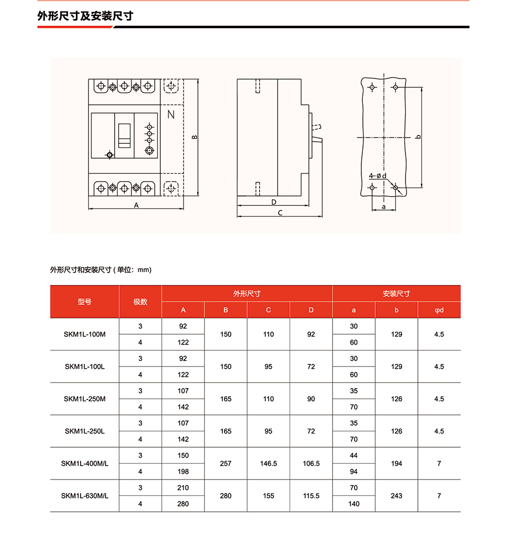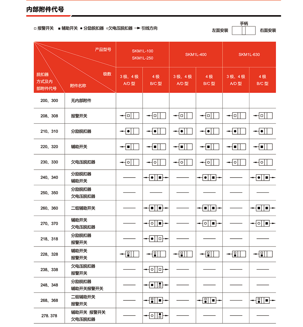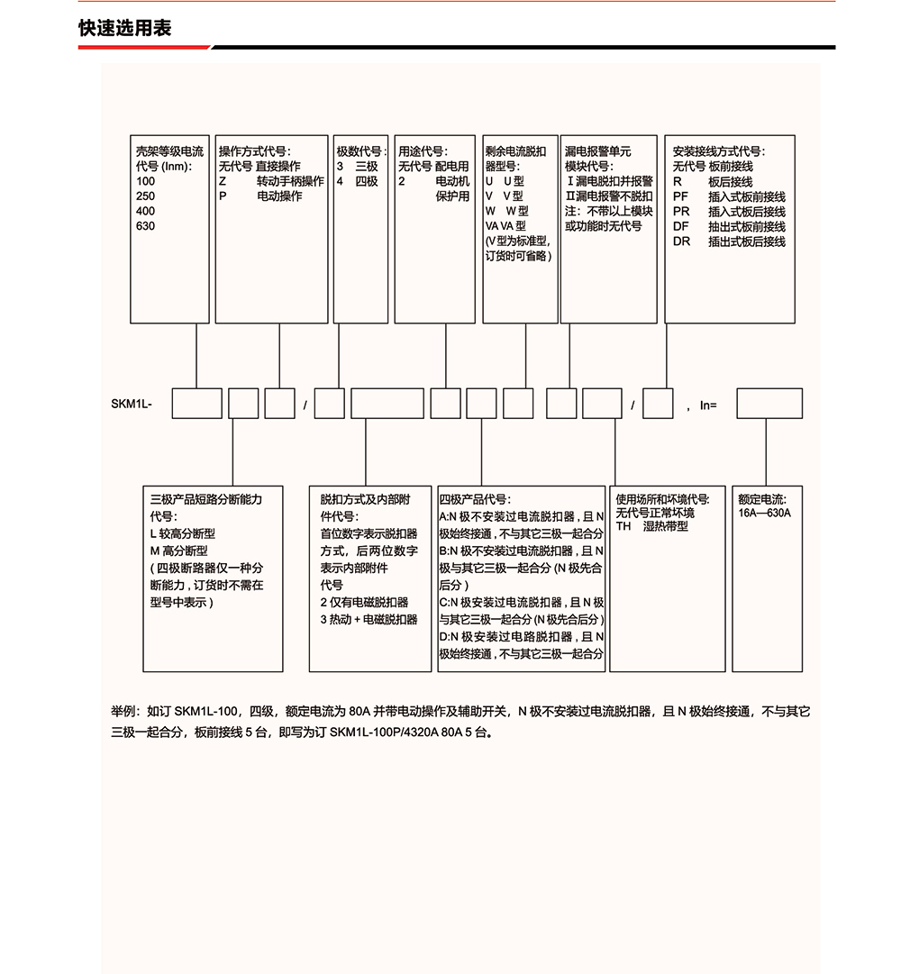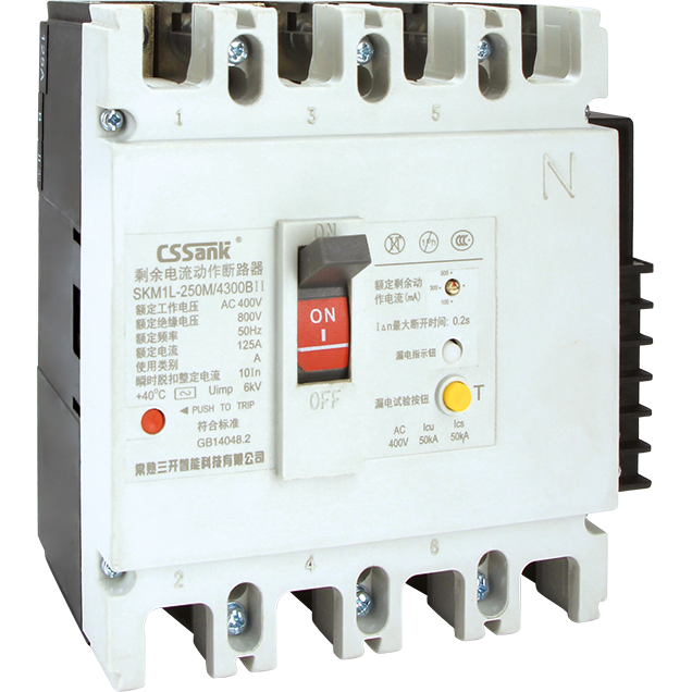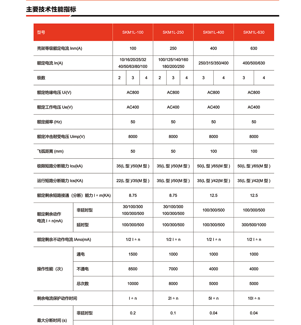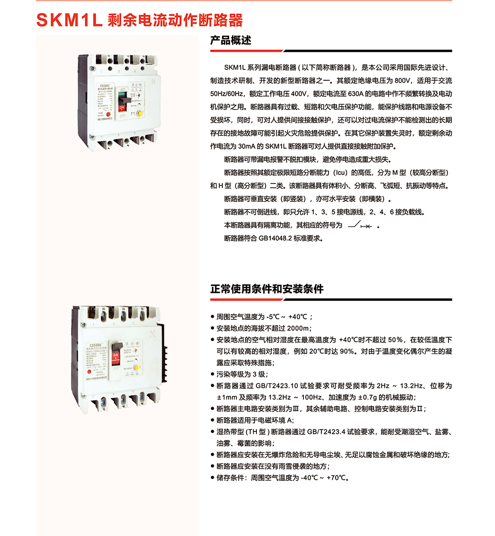 概述:SKM1L系列漏电断路器(以下简称断路器),是本公司采用国际先进设计、制造技术研制、开发的新型断路器之一。其额定绝缘电压为800v,适用于交流50Hz/60Hz,额定工作电压400V,额定电流至630A的电路中作不频繁转换及电动机保护之用。断路器具有过载、短路和欠电压保护功能,能保护线路和电源设备不受损坏,同时,可对人提供间接接触保护,还可以对过电流保护不能检测出的长期存在的接地故障可能引起火灾危险提供保护。在其它保护装置失灵时,额定剩余动作电流为30mA的 SKM1L断路器可对人提供直接接触附