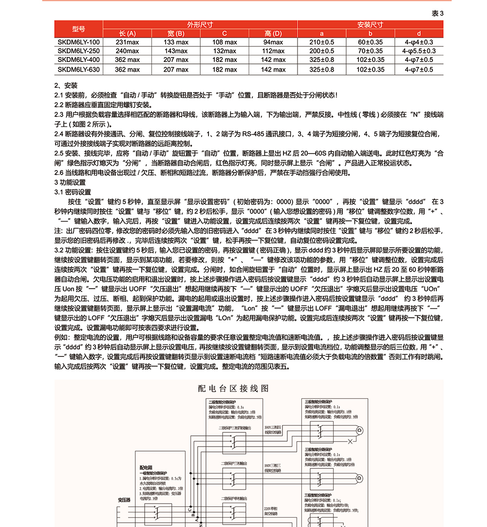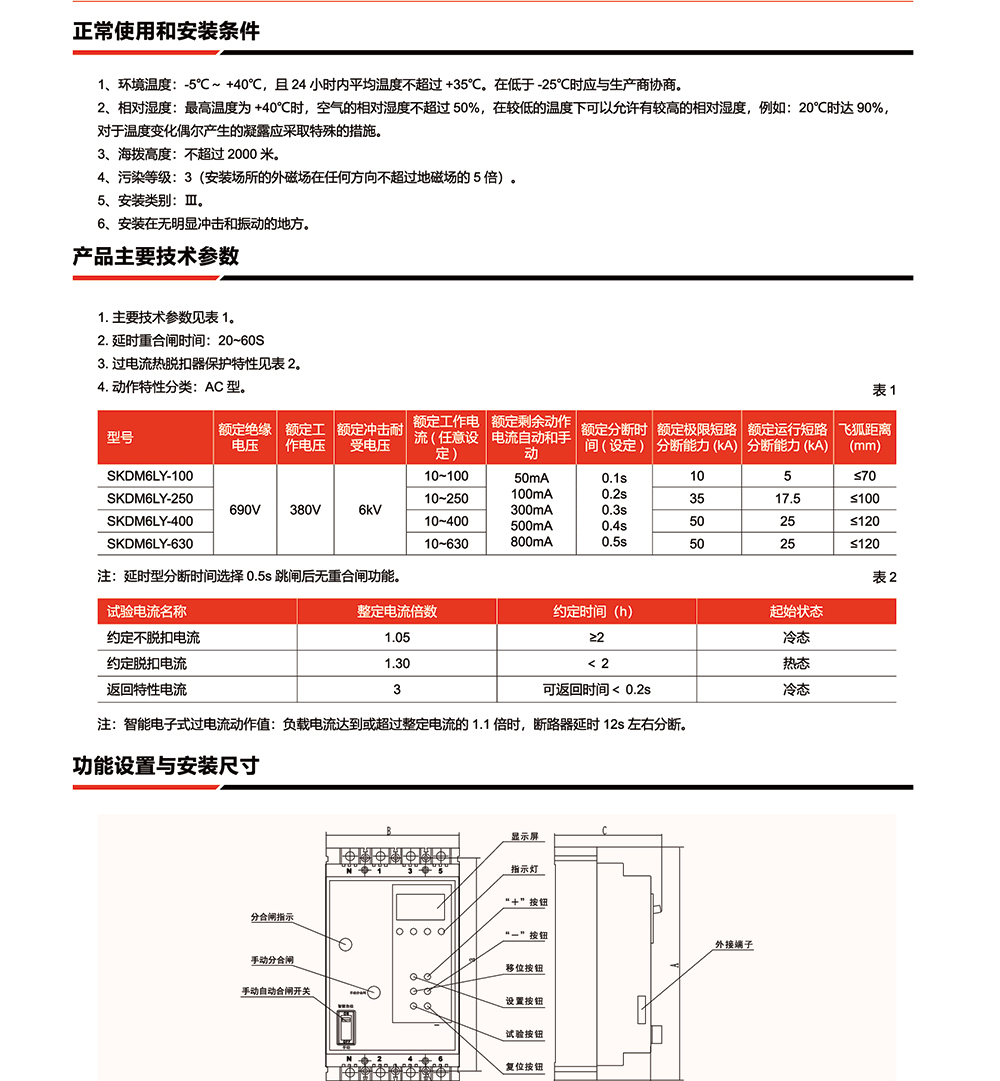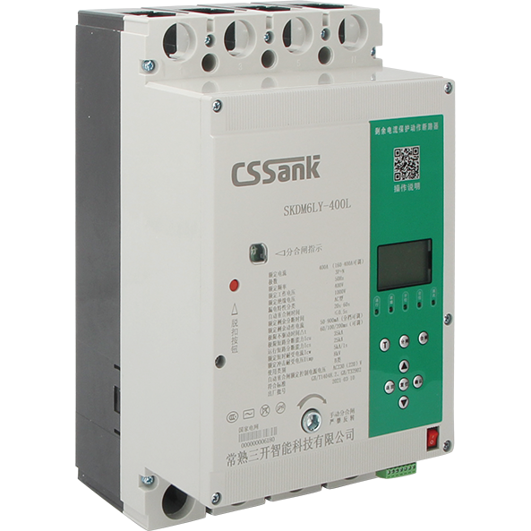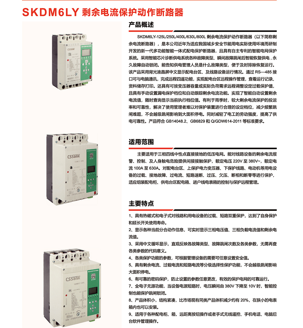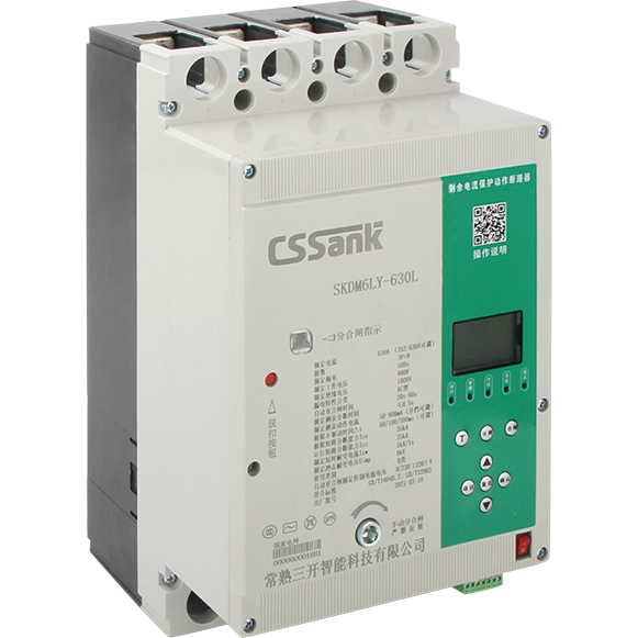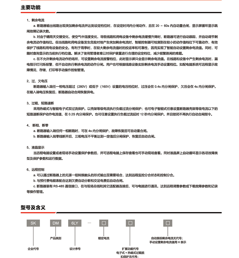 概述:SKDM6LY-125L/250L/400L/630L/800L剩余电流保护动作断路器(以下简称剩余电流断路器),是本公司近年为适应我国城乡安全节能用电实际使用环境而研制开发的新一代多功能智能一体式配电保护断路器,且具有自主专利的智能电网保护系统。采用智能芯片诊断供电系统各种故障类型、瞬间故暲跳闸后智能恢复供电,永久故障自动锁闭。能告知供电管理人员是什么故障类型,便于及时排除恢复运行。该产品采用背光液晶屏中文显示配电台区、及线路设备运行情况。通过RS—485接口可与电脑通讯,完成远程四遥功能,实