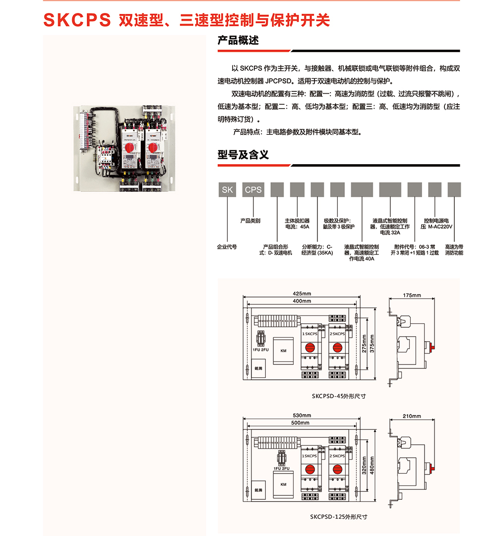 概述:以SKCPS作为主开关,与接触器、机械联锁或电气联锁等附件组合,构成双速电动机控制器JPCPSD。适用于双速电动机的控制与保护。 双速电动机的配置有三种:配置一:高速为消防型(过载、过流只报警不跳闸),低速为基本型;配置二:高、低均为基本型;配置三:高、低速均为消防型(应注明特殊订货)。 产品特点:主电路参数及附件模块同基本型。